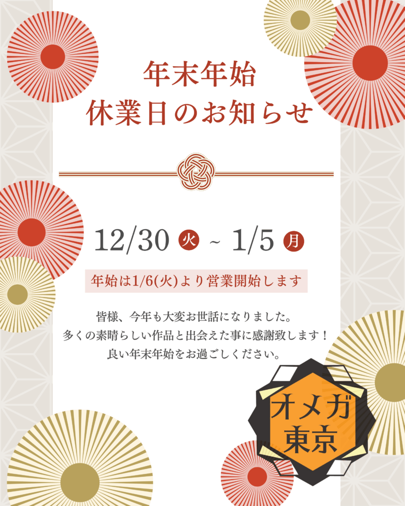 尚、12/30(火)~1/5(月)まで全ての業務をお休みとさせて頂きます。